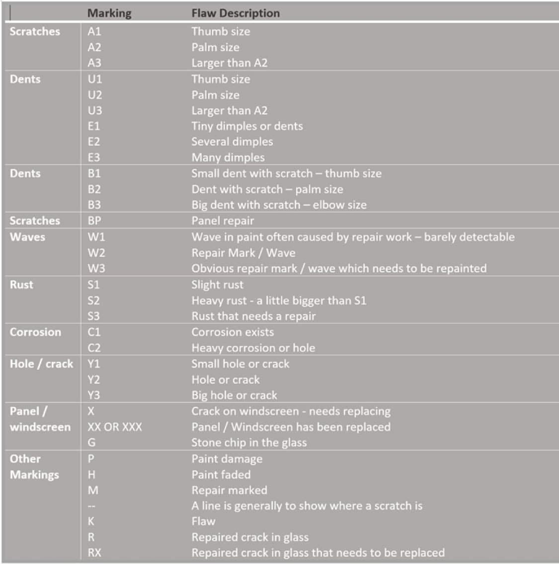 As we mentioned before, each car is given a grade for the interior and exterior condition of the car. Exterior grading ranges from 1 too S and the interior ranges from A too D. There are many more annotations which may be written on the condition report. Specifying a dent or a scratch. For a detailed explanation of condition report please read the diagram below